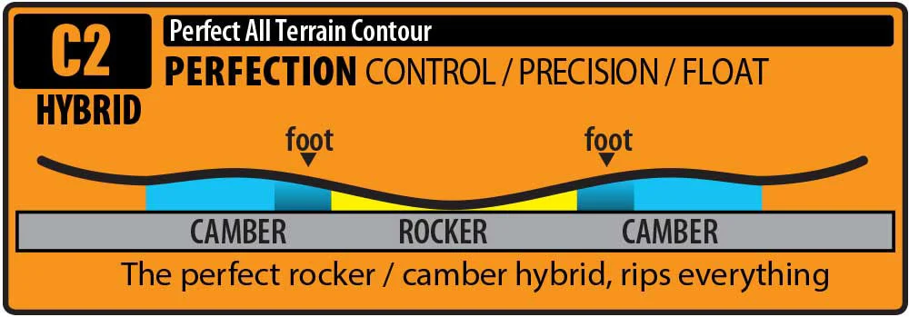Om de all terrain boards een perfect gebalanceerd profiel te geven heeft Lib Tech samen met Travis Rice de C2 shape ontwikkeld. Een milde rocker tussen je voeten met een krachtige camber bij de tip en tail. Genoeg pop voor het park, precisie voor de beste lijnen en float om los te gaan in de poeder.