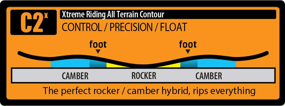 Om de all terrain boards een perfect gebalanceerd profiel te geven heeft Lib Tech samen met Travis Rice de C2 shape ontwikkeld. Een milde rocker tussen je voeten met een krachtige camber bij de tip en tail. Genoeg pop voor het park, precisie voor de beste lijnen en float om los te gaan in de poeder. Bij de C2e variatie is het profiel net wat speelser en de C2x heeft nog meer precisie.